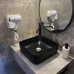 Some bathrooms have a separate toilet and a shower, along with hair dryers and towels.